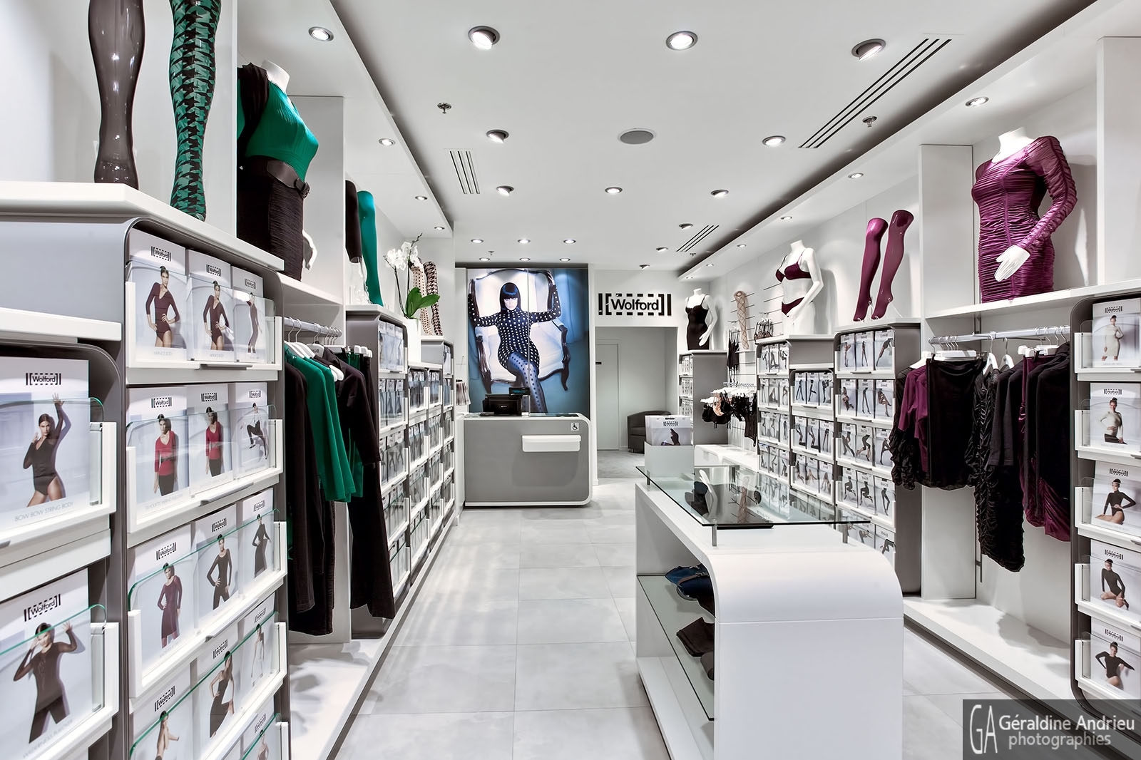 Photographies de boutiques, stands, showrooms, pop up store, architecture, espaces de vente, design, événementiel. Corner Wolford Parly 2 Le Chesnay