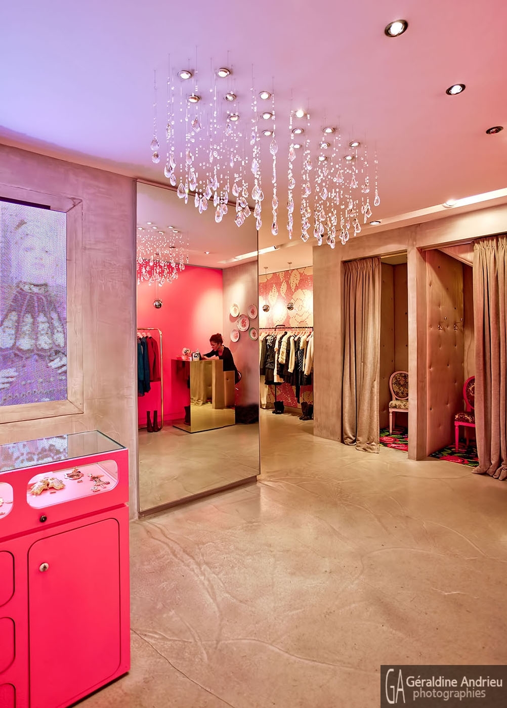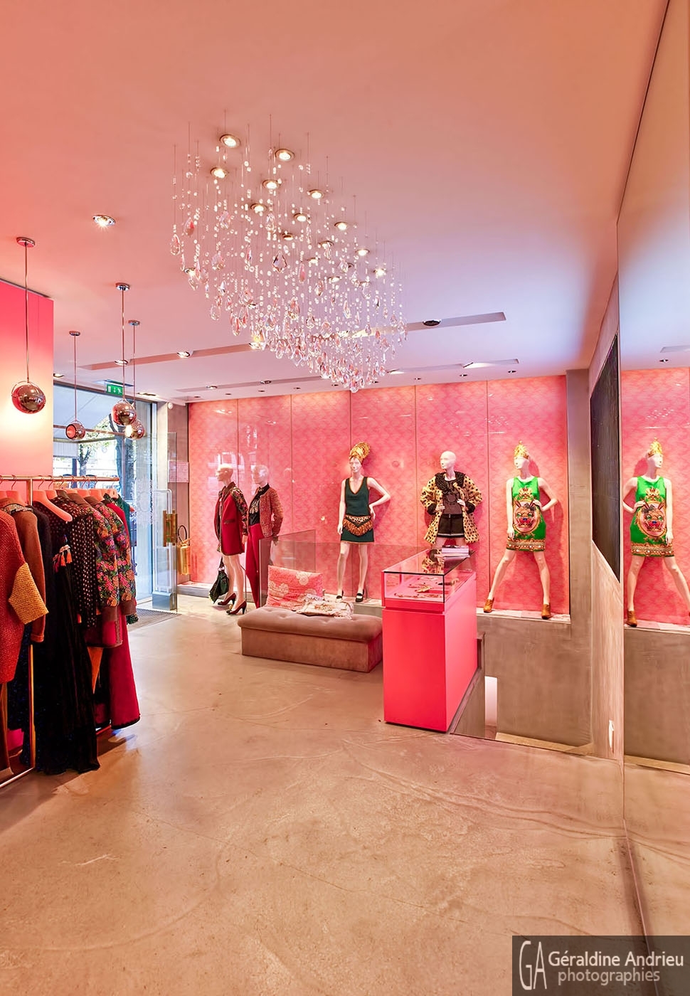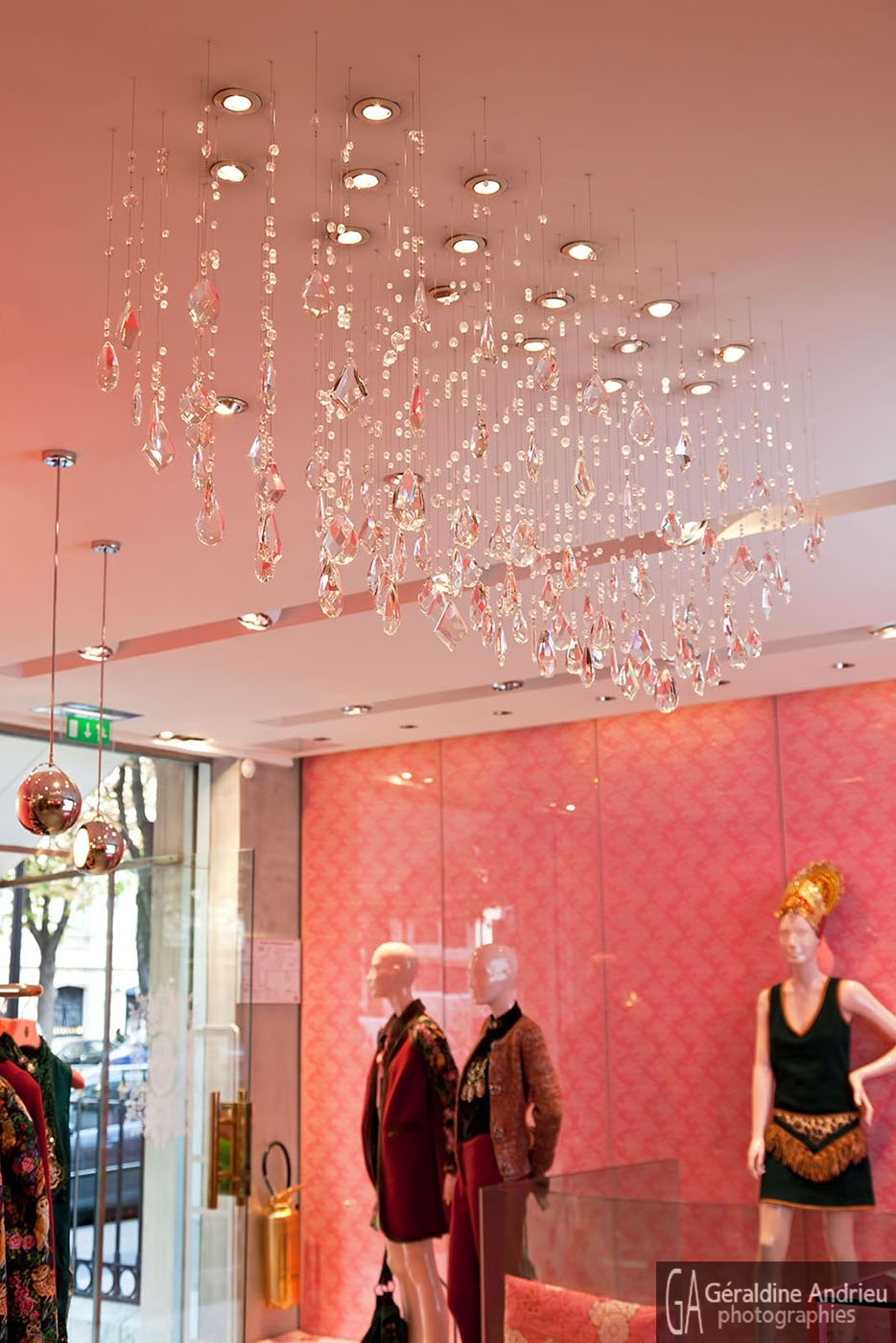Photographies de boutiques, stands, showrooms, pop up store, architecture, espaces de vente, design, événementiel. Lustre Giovanna Dessi Boutique Manoush Montaigne Paris