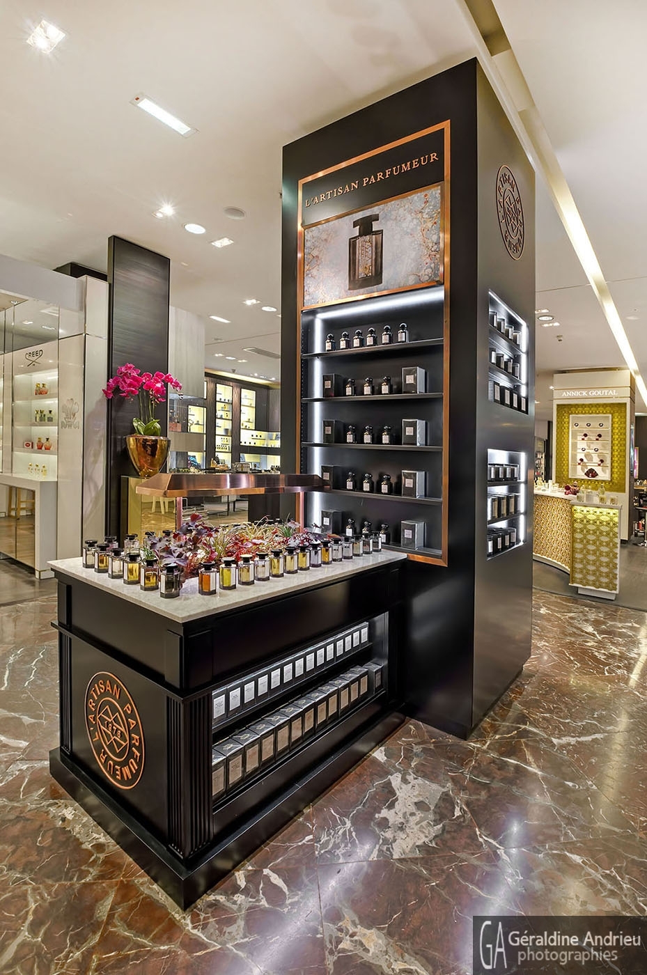 Photographies de boutiques, stands, showrooms, pop up store, architecture, espaces de vente, design, événementiel. Stand Artisan parfumeur Printemps Paris